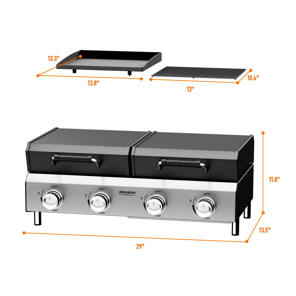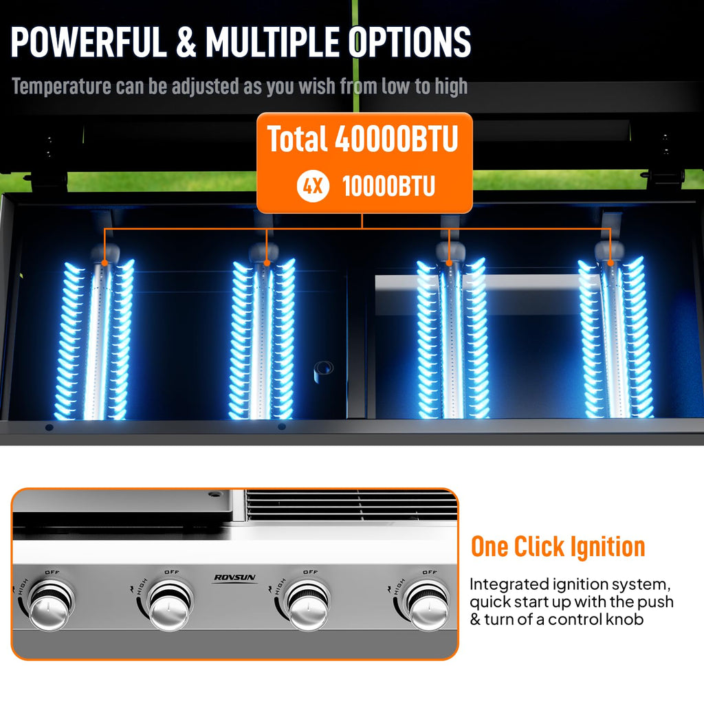 2. Powerful 40,000 BTU Output: Four independent 10,000 BTU burners deliver strong, adjustable heat with precise temperature control. Achieve perfect searing on the grill and even heating on the griddle simultaneously.