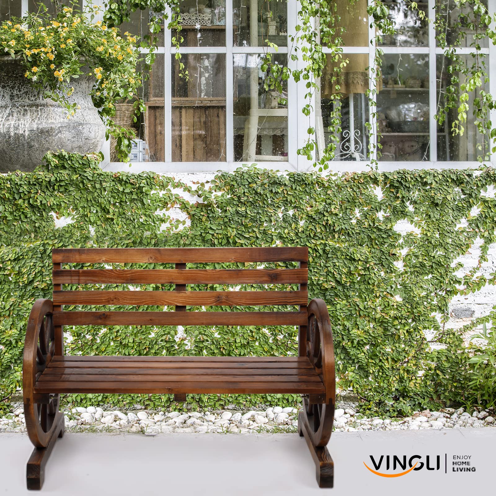 2. Unique Design: Wagon wheel armrests with large slatted back and seat make this bench a stylish and comfortable place to rest.