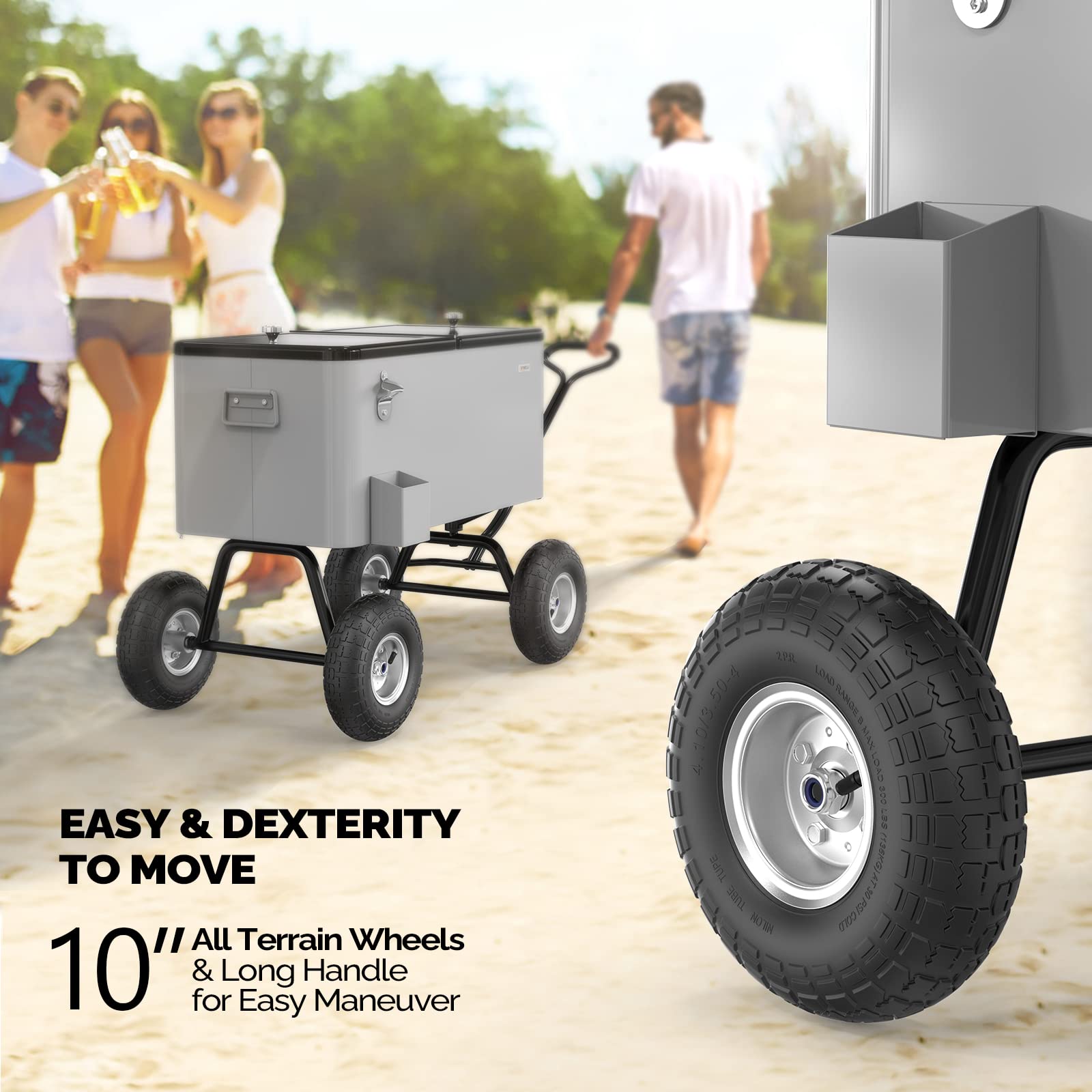 2. Easy & Dexterity to Move: This outdoor cooler on wheels features four large 10" inflatable all 4 terrain wheels for use in the yard and beach. Plus, its long handle makes it very easy to maneuver around on most outdoor condition.