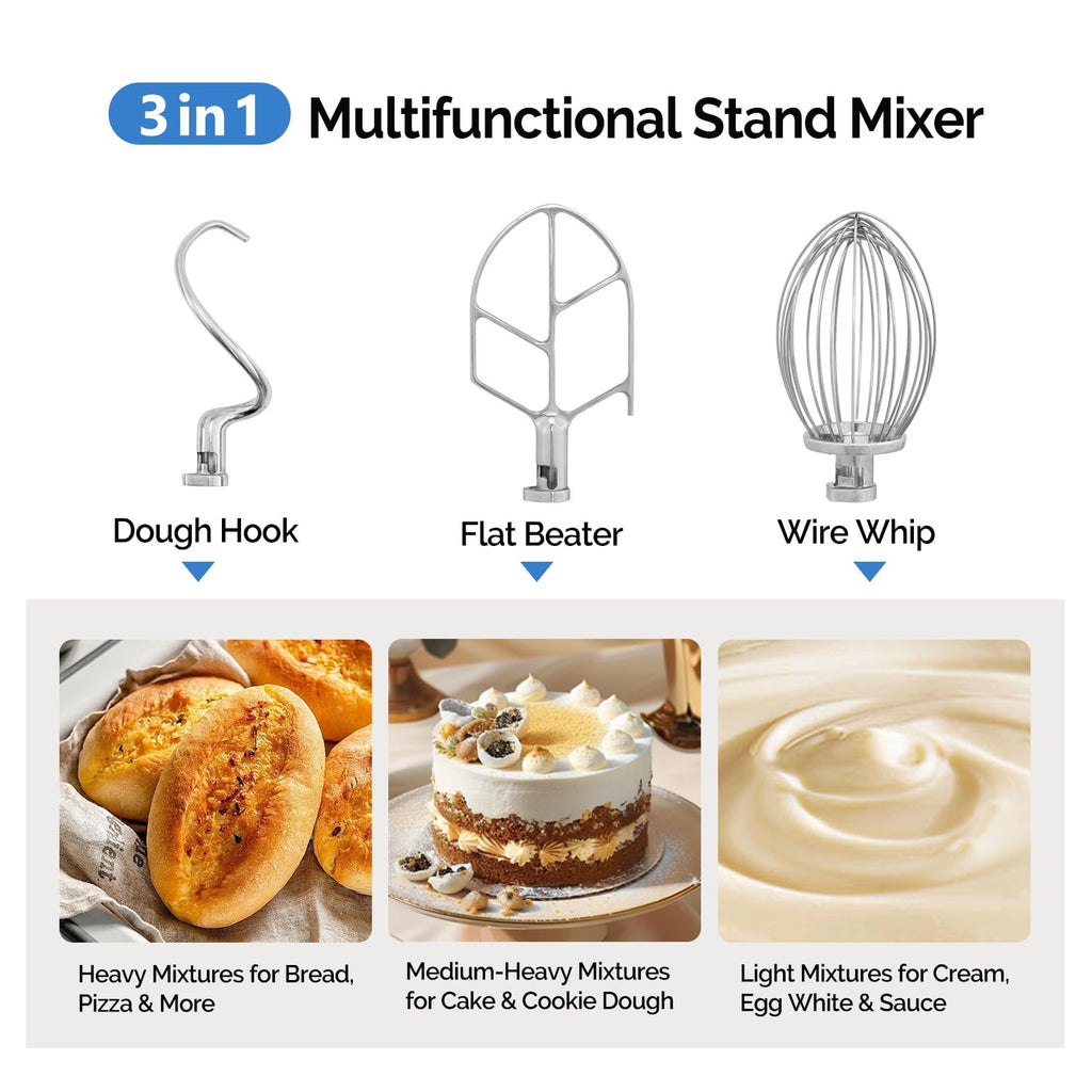 3. 3 Different Mixers: The machine comes with 3 mixers, including a dough hook, wire whisk and flat beater, you can choose the one which you need. The dough hook is used to smoother mixer operation, ideal for heavy dough. The flat beater is suitable for mashing potatoes or vegetables, mixing cakes, batters, or icing. The wire whip is applied in aerating light mixes such as whipped cream, egg white.