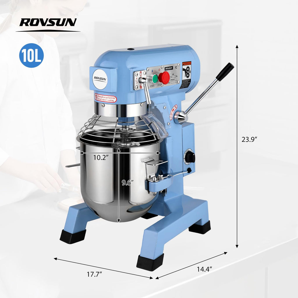1. 10 QT Capacity: The industrial mixer is equipped with a 10 QT capacity stainless steel bowl, meeting your various commercial needs. You can mix dough up to 1 kg / 2.2 lbs at one time. All parts that come into contact with food adopt food-grade stainless steel.