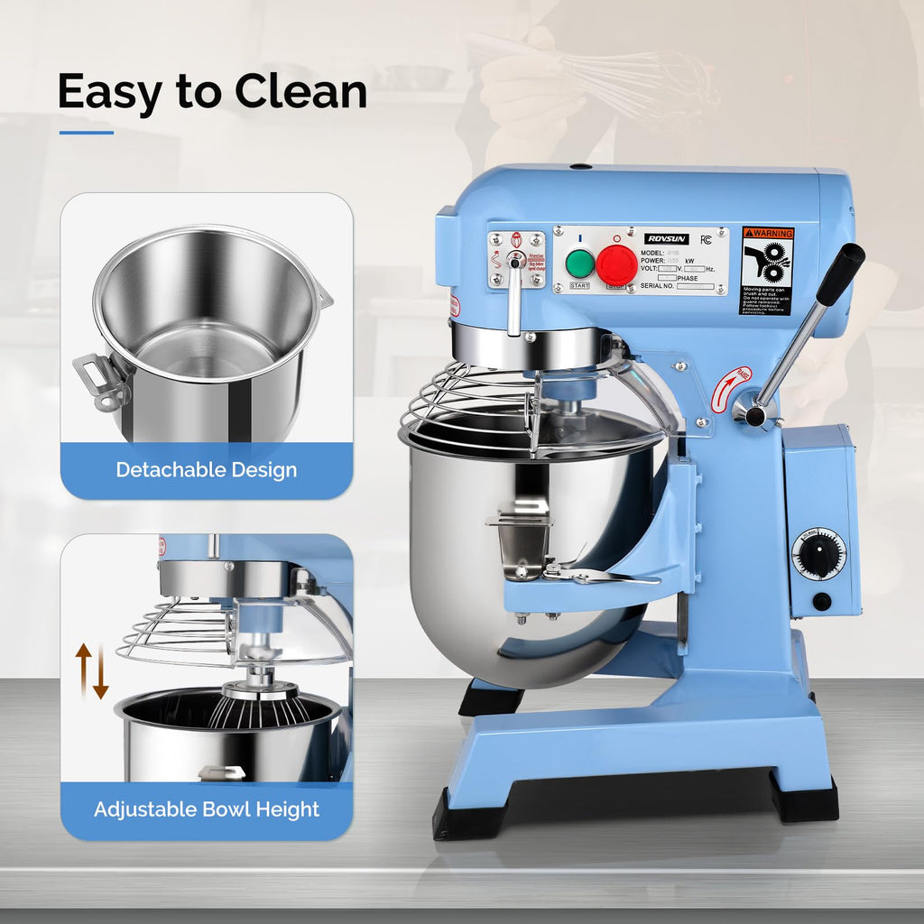 2. High-Efficient Mixing: This commercial dough mixer comes with a powerful 550 W motor to improving work efficiency.The noise is low even after long-term use. And 3 adjustable speeds can meet different mixing requirements, high speed 409 RPM for mixing cream and egg whites, medium speed 225 RPM for mixing fillings and low speed 135 RPM for mixing dough.