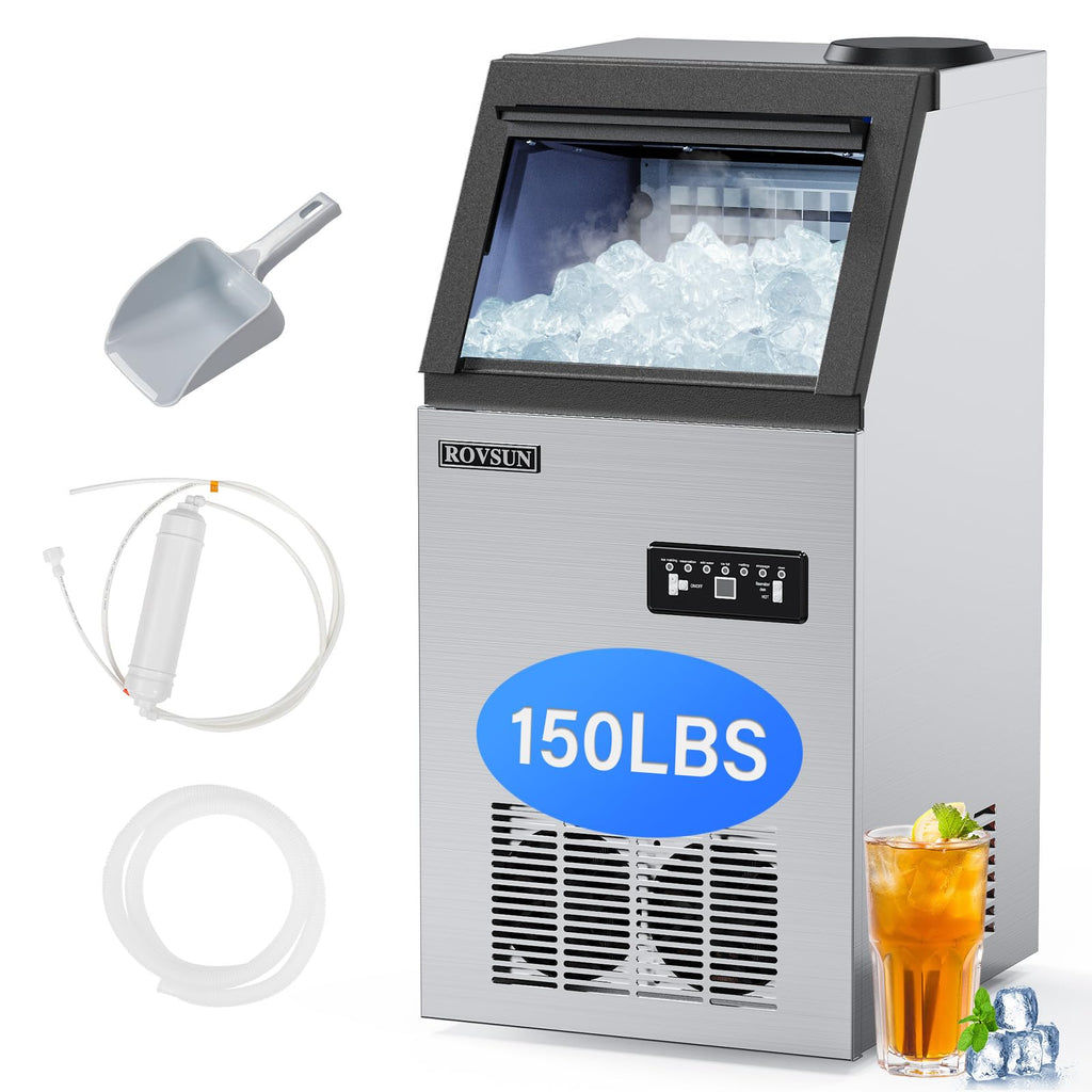 1. High Efficiency: This ice machine has powerful compressor can produce 150 pounds of ice a day; a bin capacity of 24lbs and has a 11 to 18 min ice making cycle; ice cube size is 0.9x0.9x0.9''.