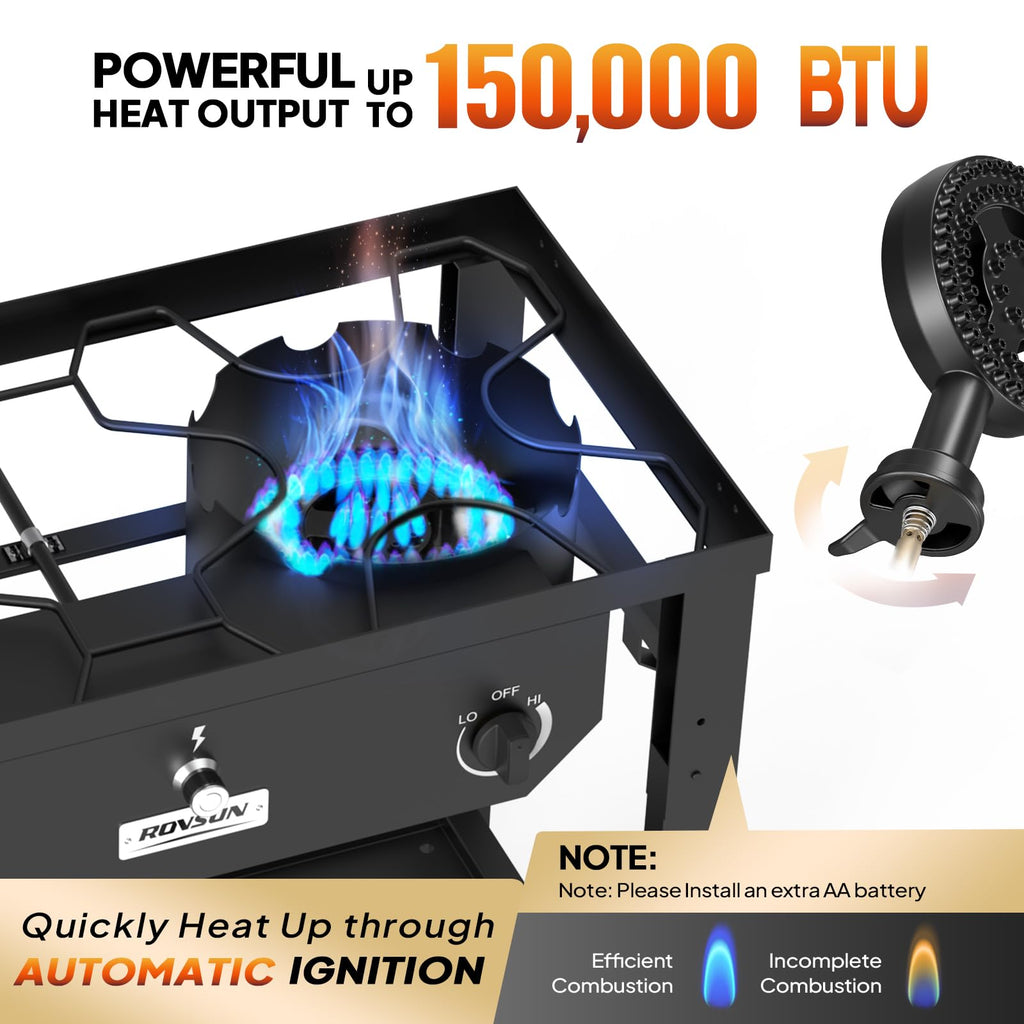 1. 150,000 BTU High-Performance Output: Dual burners deliver 150,000 BTU total with independent controls. Precision heat from low simmer to high flame for searing, boiling, frying, and brewing.