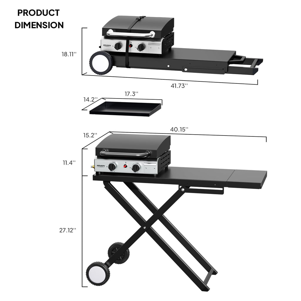 1. Powerful Heating: Our product is equipped with 2 independent stainless steel burners, each capable of providing 10,000 BTUs of heat. With both burners in use, you will have 20,000 BTUs of heat that can reach up to 750°F, and you can adjust the flame size as needed, providing a variety of cooking options. Whether it's cooking eggs, pancakes, grilling cheese, or steak, you can do it all with ease.