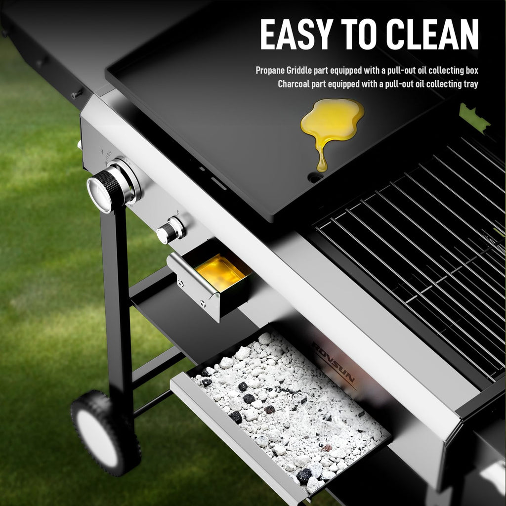 4. Easy-Clean System: The gas side features sloped grease channels and a removable drip tray; the charcoal side includes a full pull-out ash drawer. Spend less time cleaning and more time enjoying your outdoor gathering.