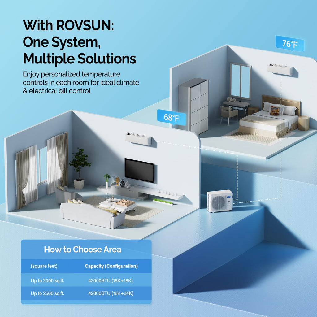 1. All-in-One for Multiple Rooms: Equipped with 1 outdoor 42000BTU condenser and 2 indoor (18000BTU + 18000BTU) air handlers with individual controllers for each room. Our mini split air conditioning and heating system offers an all-season solution with air conditioning, powerful heat pump, dehumidifier, fan, and speed-up turbo function. Each room has individual temperature control for ideal climate control.