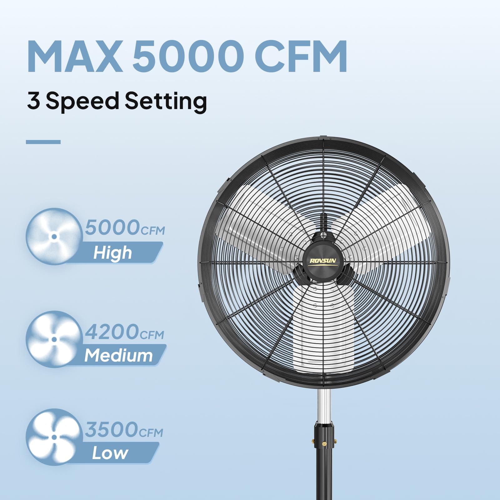 1. Heavy-Duty Performance: This 20'' industrial pedestal fan delivers 5,000CFM maximum airflow with 3-speed settings. The high velocity fan achieves 24ft/s wind speed for efficient air circulation in large spaces.