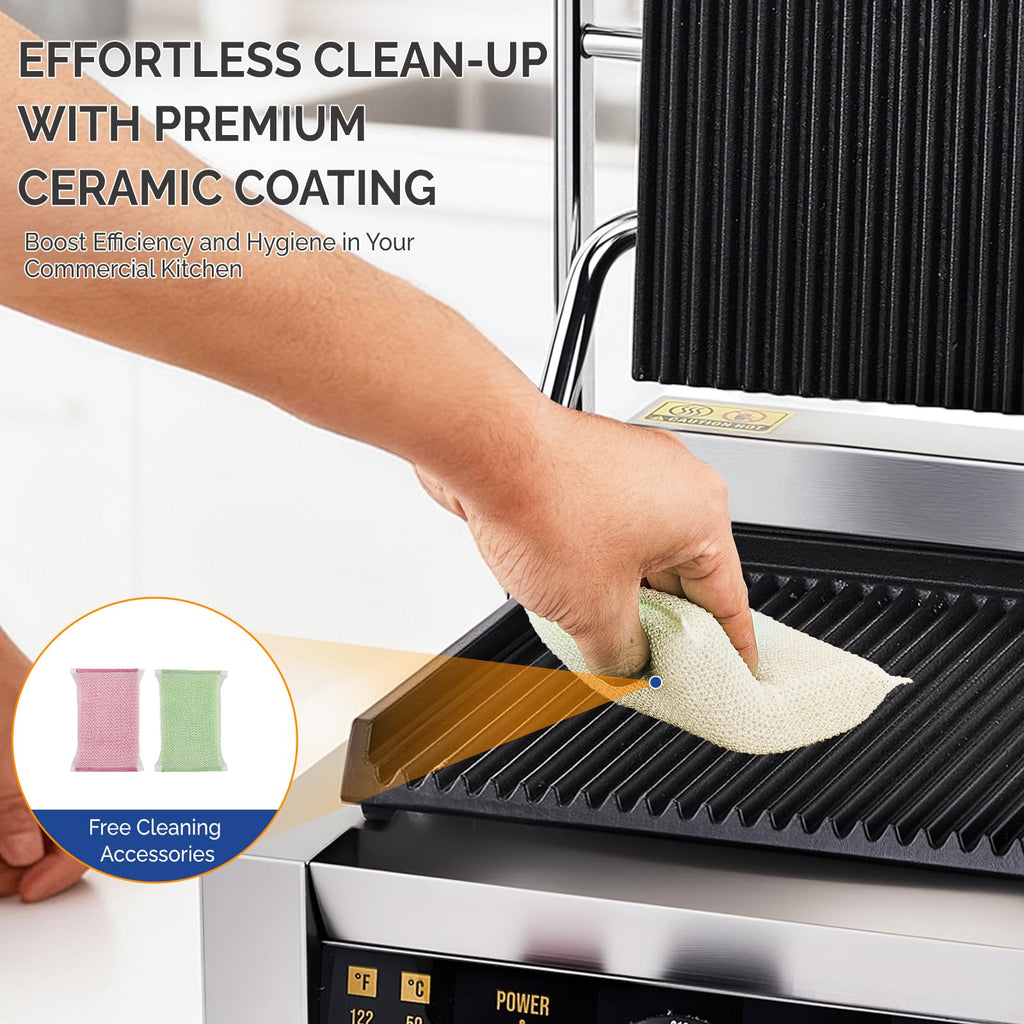4. Durable & Easy to Clean: Constructed with a stainless steel housing and durable cast iron plates, this grill is built to last. The premium ceramic coating efficiently blocks excess oil and food residues, making cleanup a breeze. It comes included with free cleaning brushes and dishcloths for your convenience.