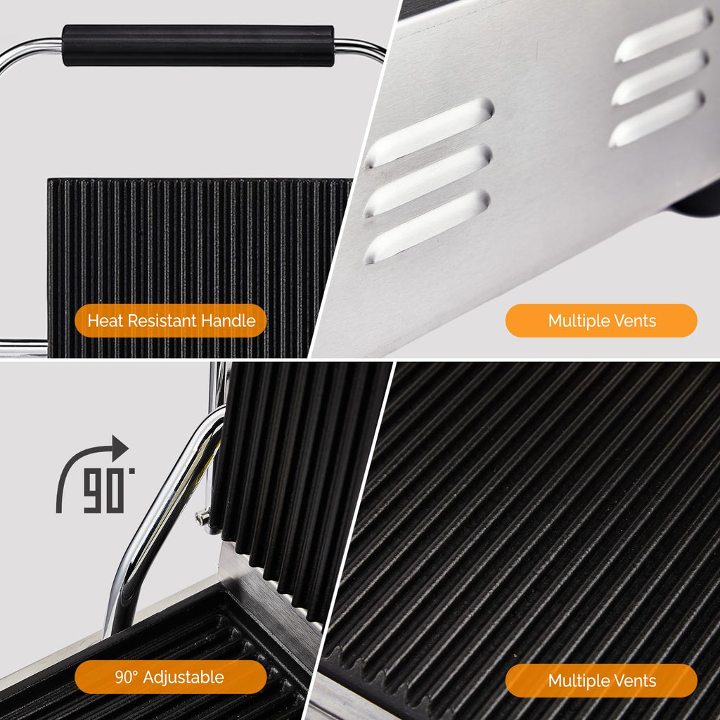 1. Professional Even Heating & Perfect Grill Marks: Equipped with thick cast iron cooking plates and a high-power heating tube, this panini grill ensures rapid and uniform heat distribution across the entire 9x9 inch surface. The top and bottom plates heat simultaneously, searing impressive grill marks into your steaks, sandwiches, and burgers for a professional finish every time.