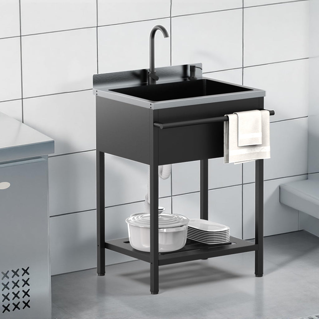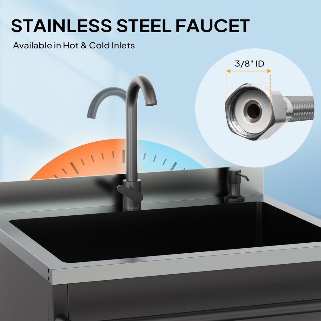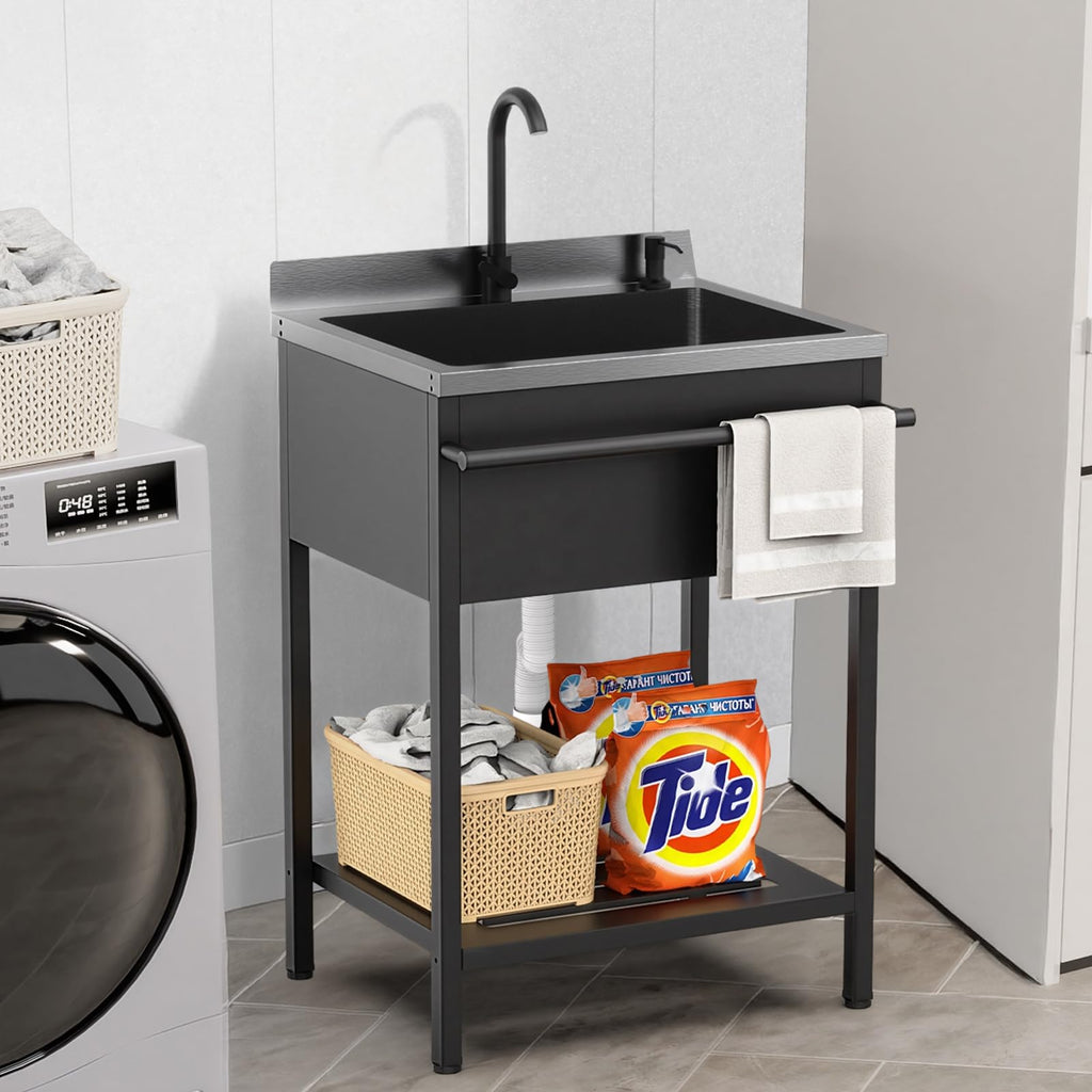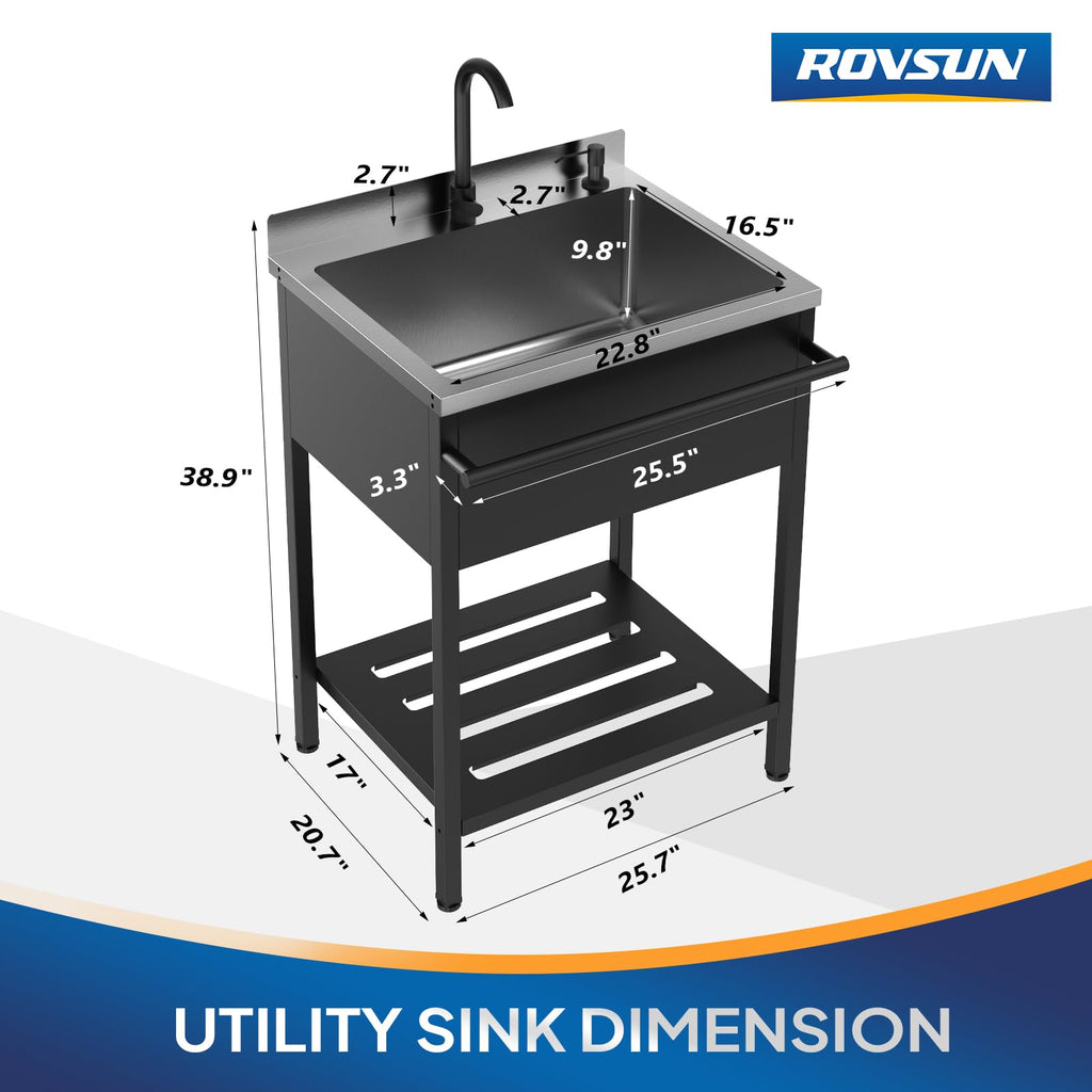 1. Compact Freestanding Utility Sink for Home & Business: The ROVSUN black stainless steel sink combines sleek design and practicality for both home and commercial use. Perfect for laundry rooms, restaurants, garages, and outdoor cleaning, this compact sink fits tight spaces without sacrificing function.
