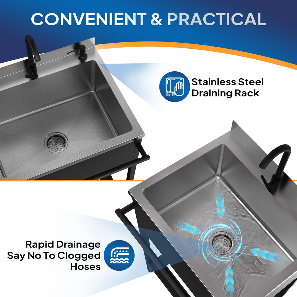 5. Multi-Purpose for Indoor & Outdoor Cleaning Tasks: From restaurant prep areas to garden washing stations or laundry basins, this stainless steel sink with rack adapts to any environment. Compact yet functional, it’s a versatile solution for both professionals and homeowners.
