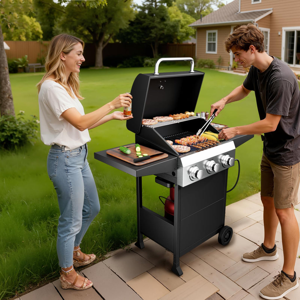 4. Thoughtful Details: With rolling wheels, our barbecue grill can be easily moved in the yard or outdoors. The bottom storage space provides you with a convenient storage solution for storing barbecue utensils and even propane cans. Moreover, foldable side tables for easier storage. Whether it's outdoor or backyard barbecue, camping, picnicking, or boating, it's an ideal choice.