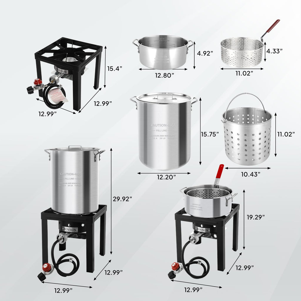 5. Fully Equipped With Accessories: The turkey fryer & fish fryer pot combo kit is equipped with a complete set of accessories that can help fry food conveniently and safely, including poultry rack with 3 pcs of metal skewer, rack lifter, 1 oz. marinade injector and 12inch probe thermometer.