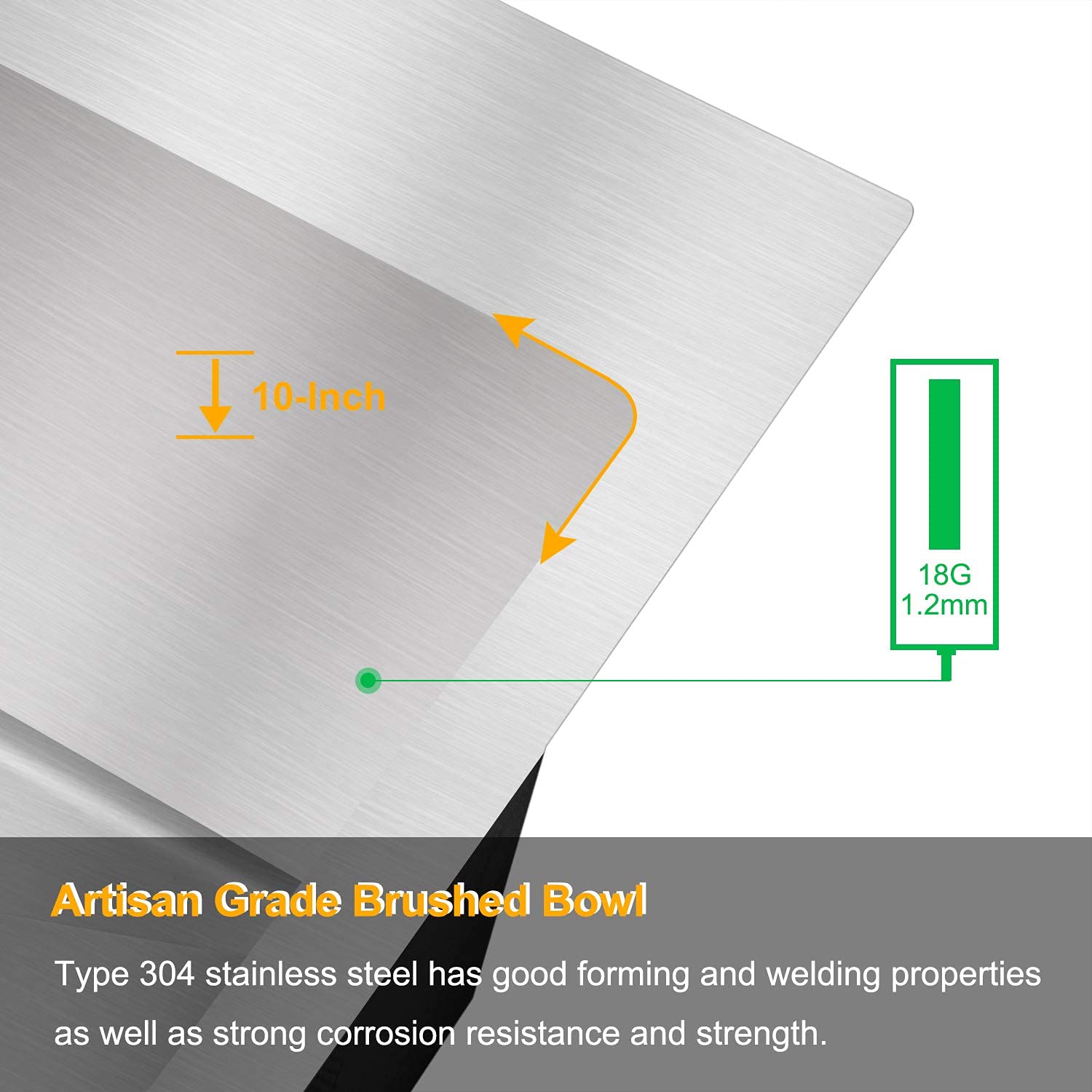 3. Thoughtful Design: Features R10° rounded corners for easy cleanup and modern aesthetic. Sloped bottom with 4 grooves ensures optimal water drainage. Stainless steel bottom checkerboard sink rack with rubber feet prevents scratching and it comes with a kitchen sink drain strainer inserted with deep basket (No faucet included).