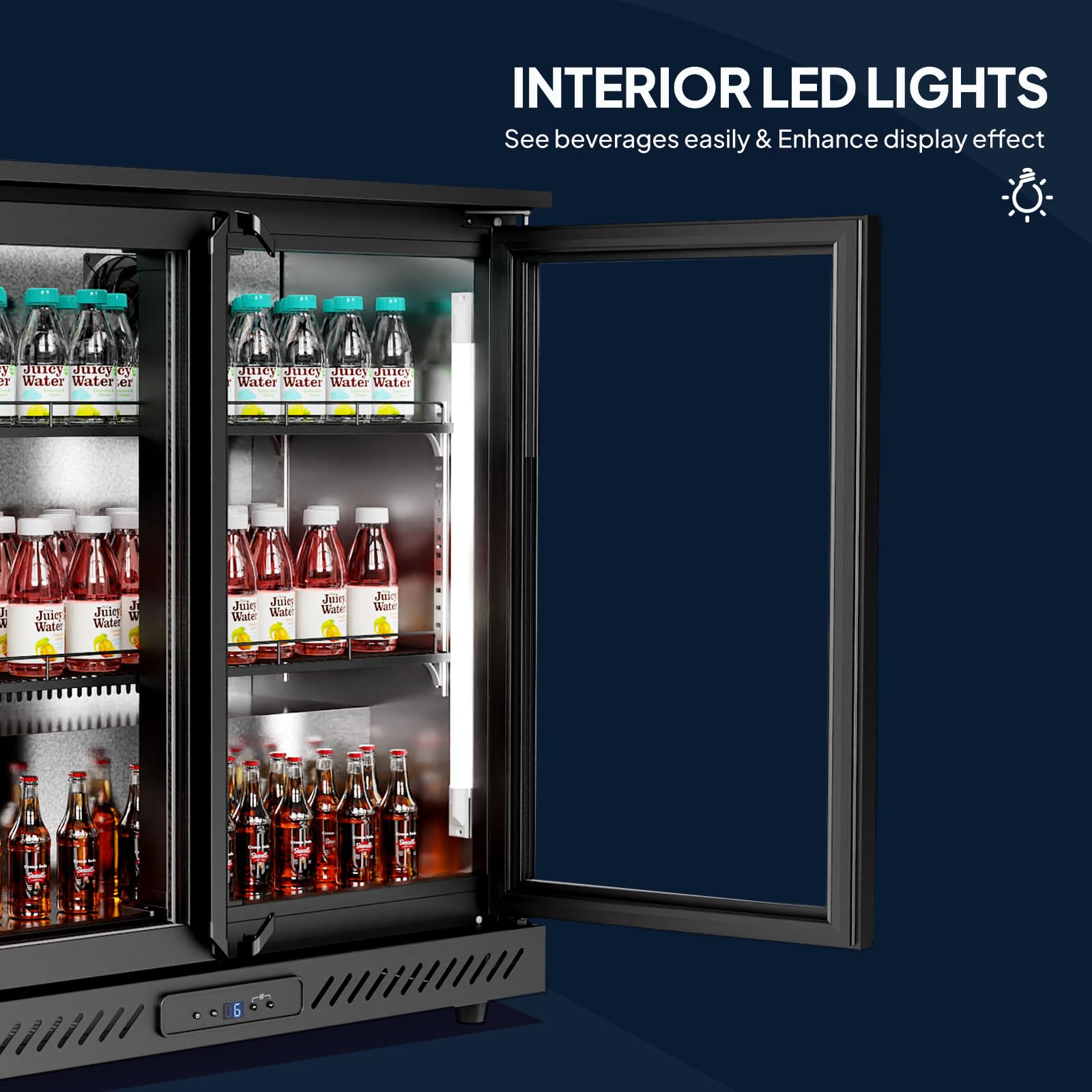 3. Professional Design & Durability: Built to withstand demanding commercial environments, this back bar cooler features premium stainless steel construction, double-pane glass doors with auto-close function, and a black powder-coated exterior that resists fingerprints and scratches. The counter-height design allows for convenient workspace above while maximizing under-counter storage.