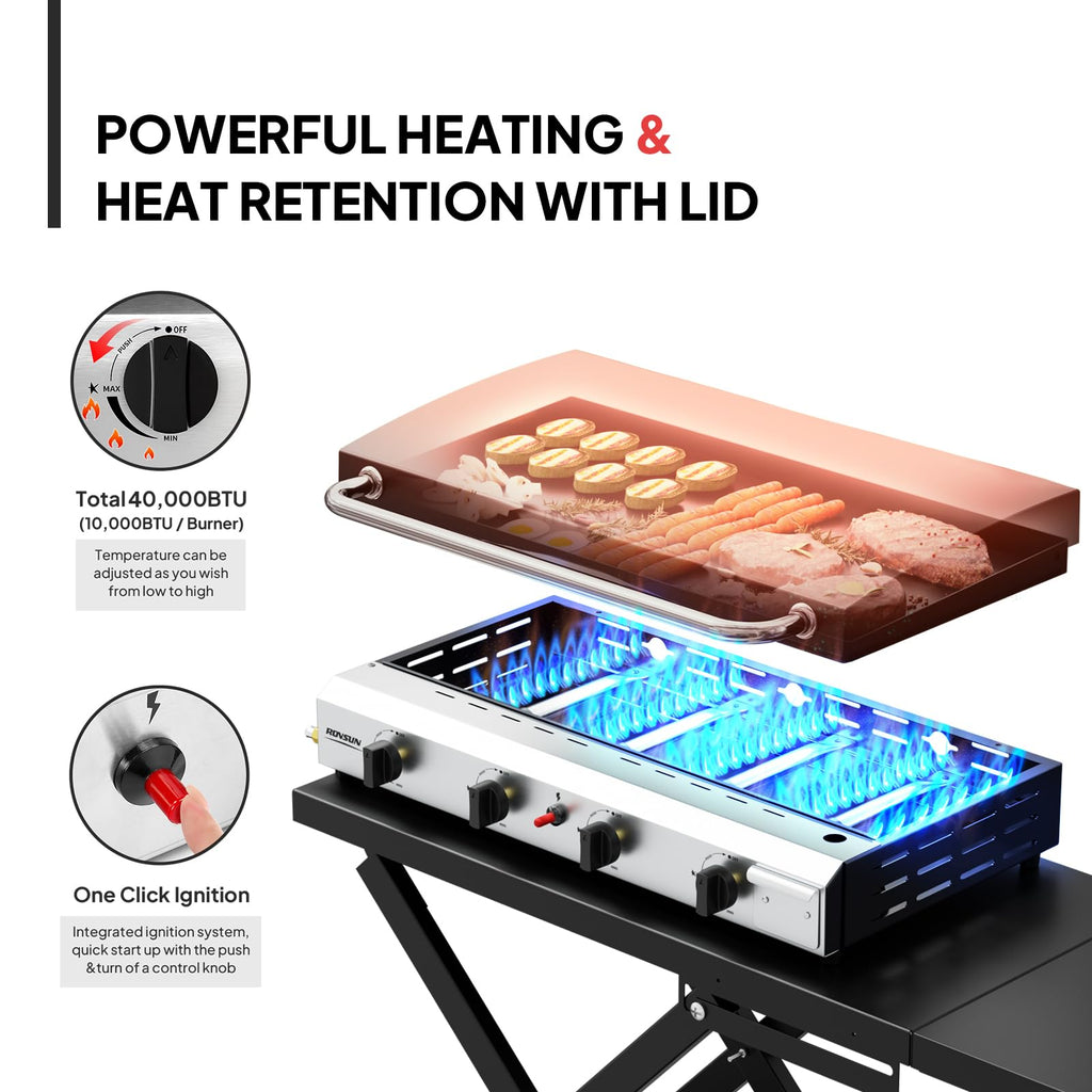 1. Powerful Heating: Our product is equipped with 4 independent stainless steel burners, each capable of providing 10,000 BTUs of heat. With four burners in use, you will have 40,000 BTUs of heat that can reach up to 750°F, and you can adjust the flame size as needed, providing a variety of cooking options. Whether it's cooking eggs, pancakes, grilling cheese, or steak, you can do it all with ease.