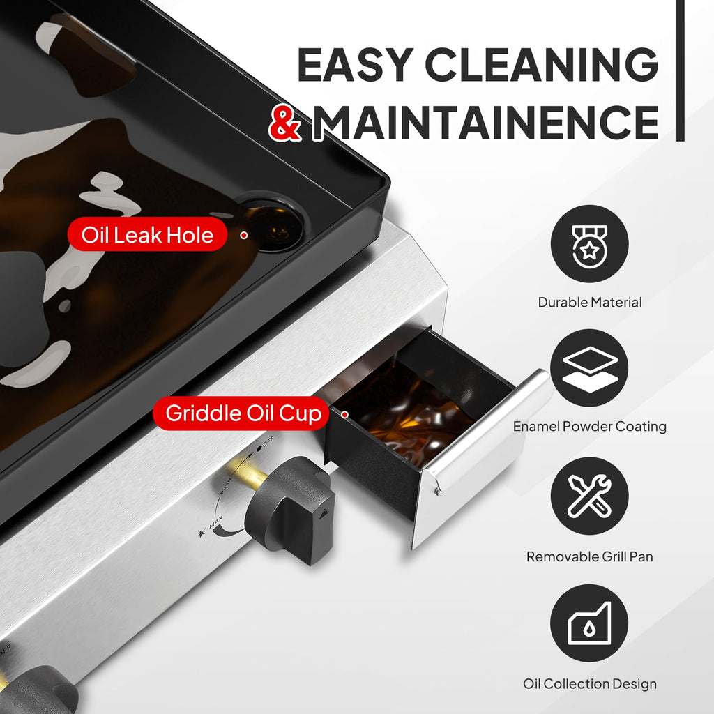 3. High Quality Materials: We use high-quality stainless steel and iron to manufacture the griddle, making it very durable. The product is designed with an oil drip tray & nonstick enamel tray for easy cleaning. After cooking, you just need to use a griddle brush to clean the cooking grates, and then wipe the exterior of the gas grill with a cleaning cloth.