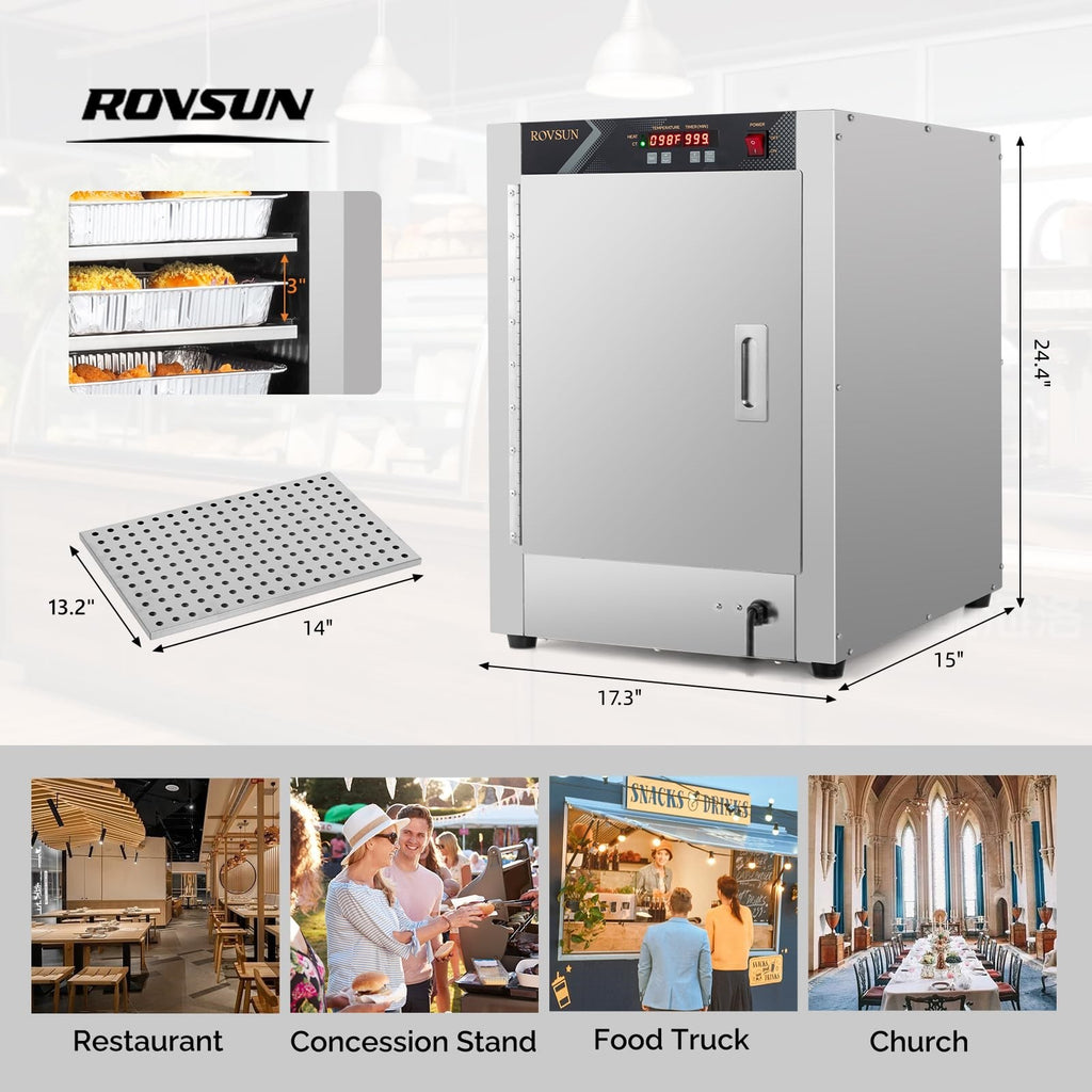 1. Spacious Design: This commercial food warmer offers ample room for your food storage needs. Four removable shelves provide flexible configuration options, whether you're reheating pizza, keeping fried foods crispy, or keeping meats juicy, this warming cabinet has you covered.