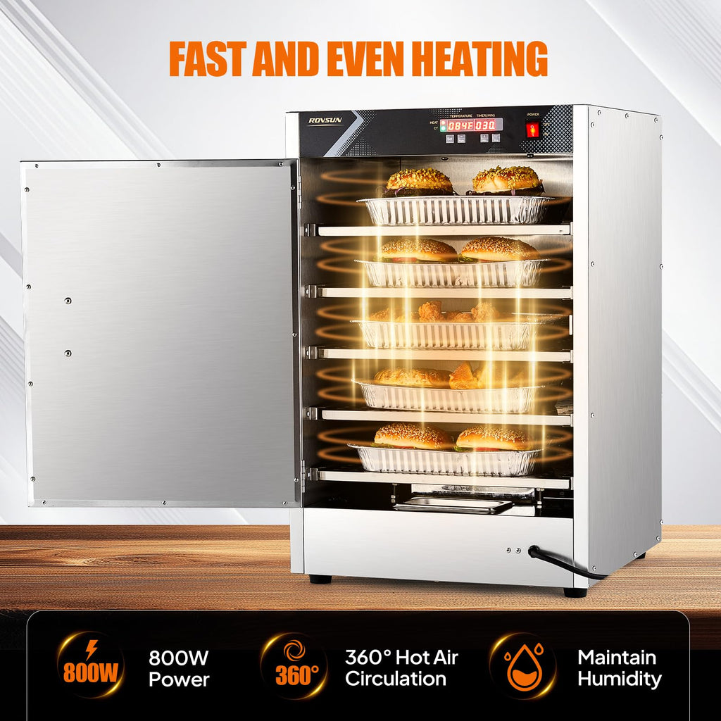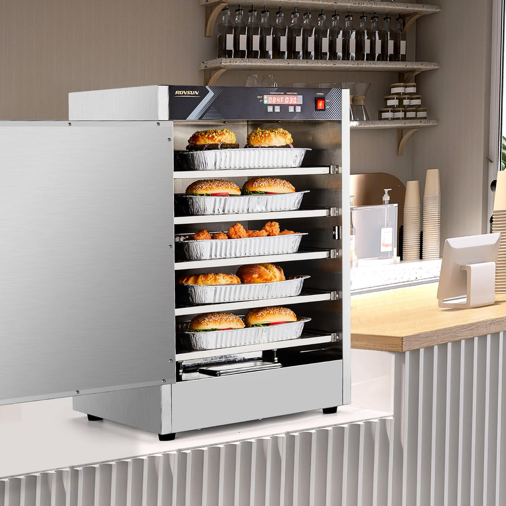 1. Spacious Design: This commercial food warmer offers ample room for your food storage needs. Four removable shelves provide flexible configuration options, whether you're reheating pizza, keeping fried foods crispy, or keeping meats juicy, this warming cabinet has you covered.