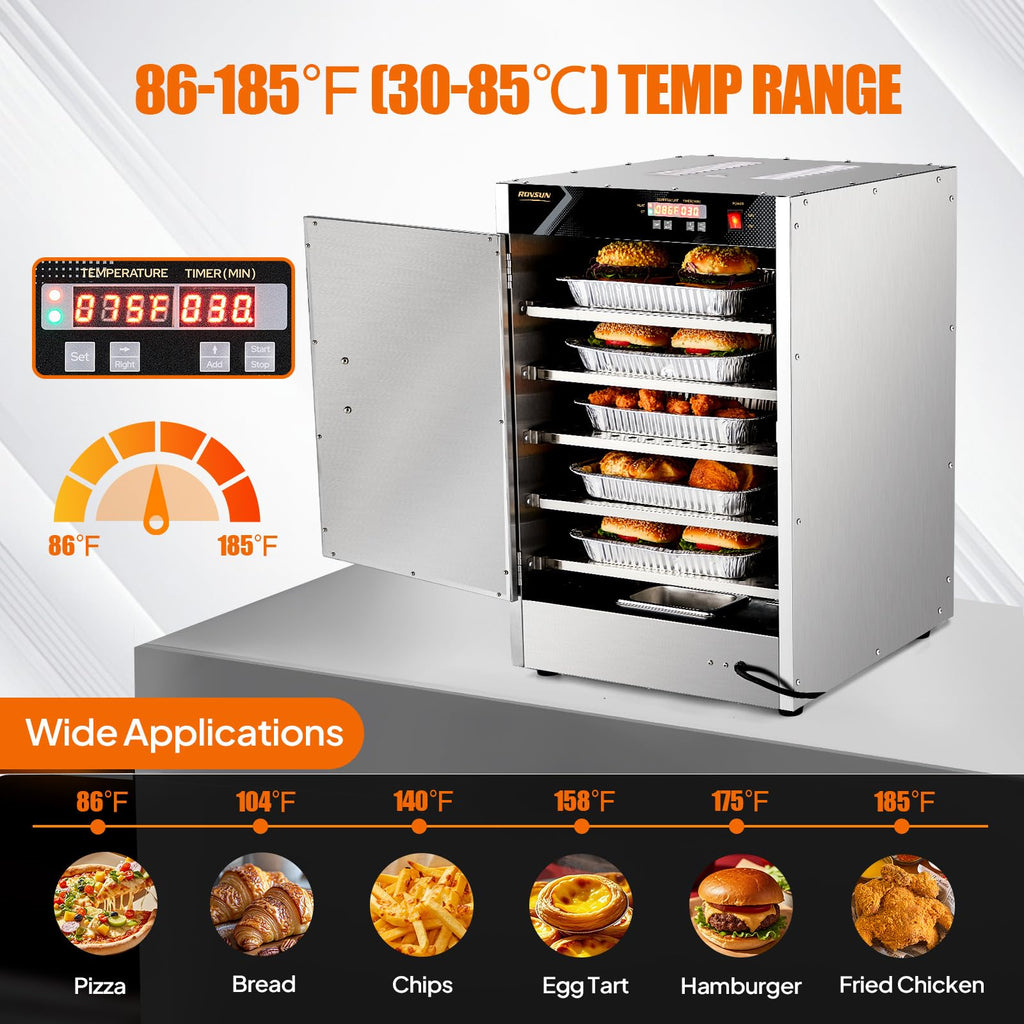 2. Precise Temp and Time Control: Our electric food warmers offer a customizable temperature range of 86-185℉ for a variety of food types.The PTC heat source ensures even air circulation and overload protection. A countdown timer of up to 999 minutes allows for precise control of holding time, ensuring that dishes are kept at the optimal temperature.