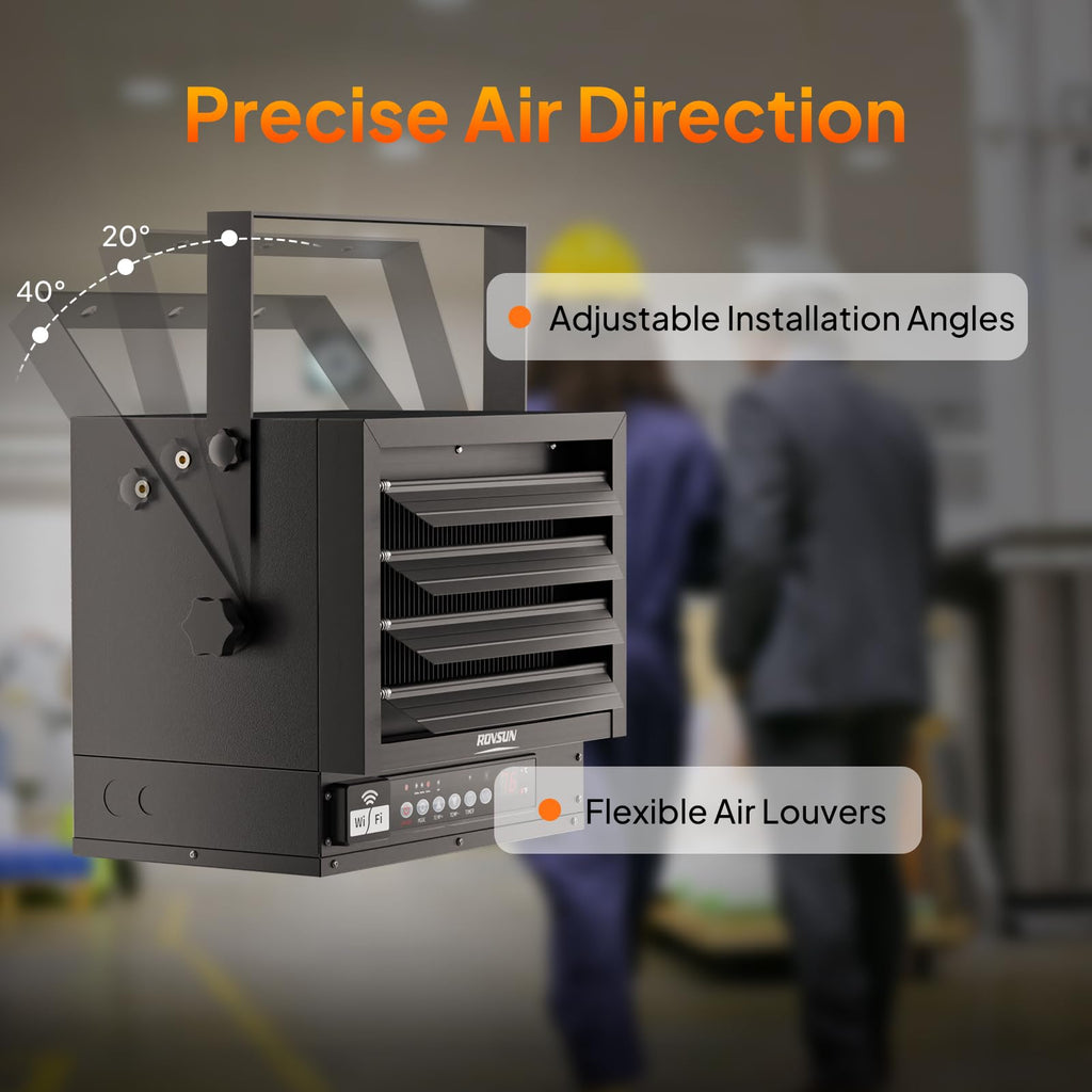 1. Rapid Heating: Utilizing an advanced fan-driven system, this ceiling heater effectively delivers 17,000BTU warmth to every corner of the room. Equipped with adjustable 0°/20°/40° directional air outlets, it allows you to customize heat flow according to your needs, ensuring uniform heating across large areas.