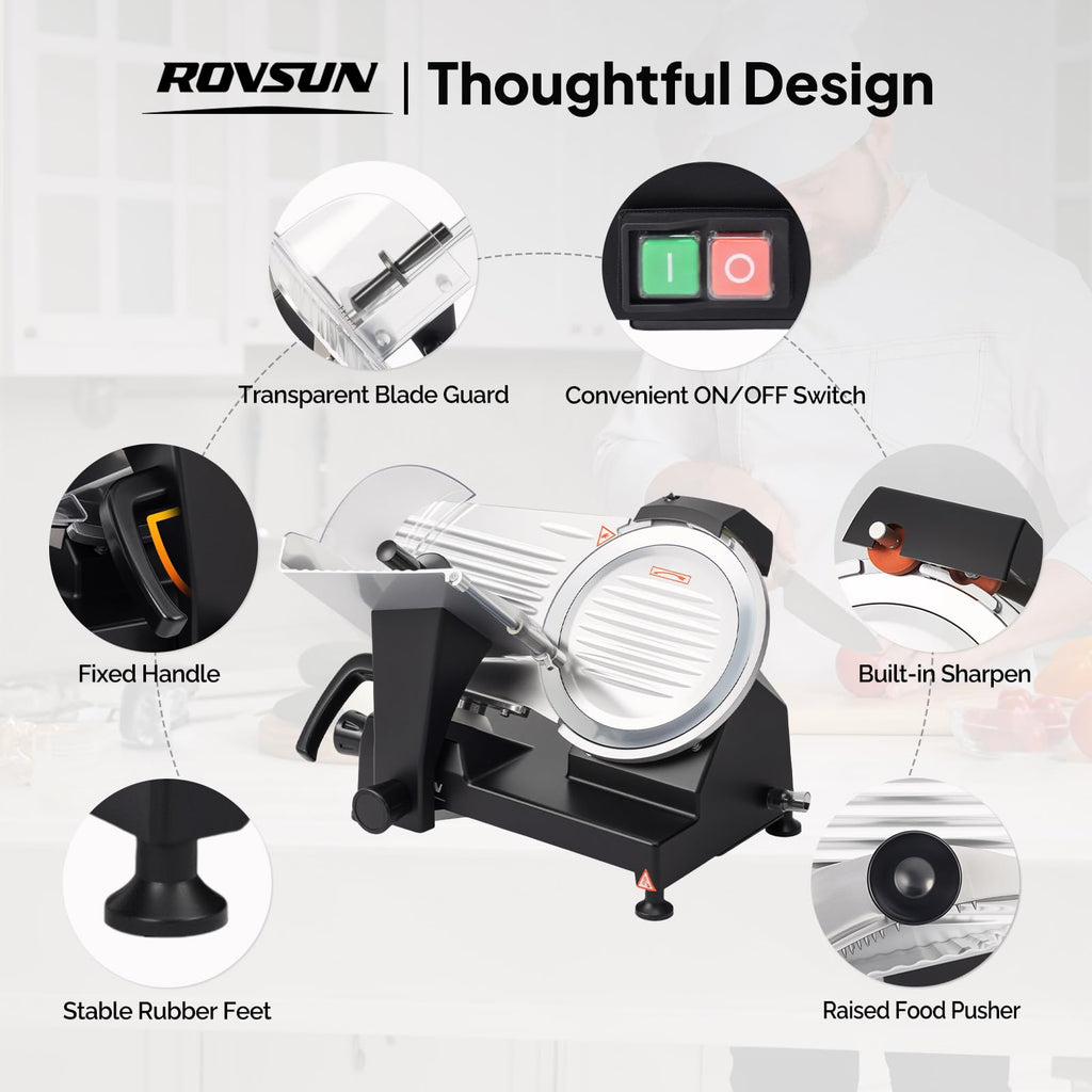 5. Safety Protection: Features with fixed transparent shield can avoid unintentional contact with the blade, so that you can prevent injuries. Non-slip rubber feet ensure stability. A food pusher for firmly holding the meat and a handle for easy operating