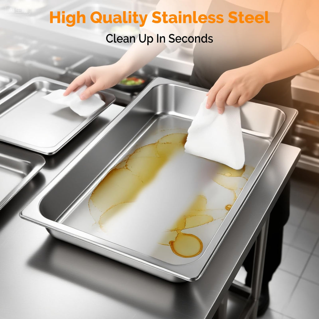 3. Food-Grade Stainless Steel: The buffet food warmers sets is made from food-grade stainless steel to ensure the safety and durability of the product.Besides, stainless steel construction is easy for cleaning with dish washing liquid and dried with a soft towel.The food pan, water pan and cover are dishwasher safe.