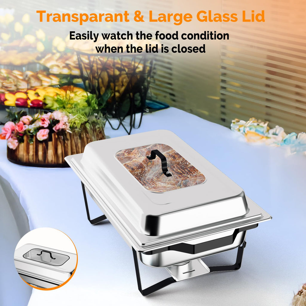 5. Convenient Glass Window: Our chafing dishes buffet set come with a viewing glass window on the lid so you can see your food without opening the lid. This visible design can prevent customers from better choosing their favorite food, without having to open the lid to rummage.