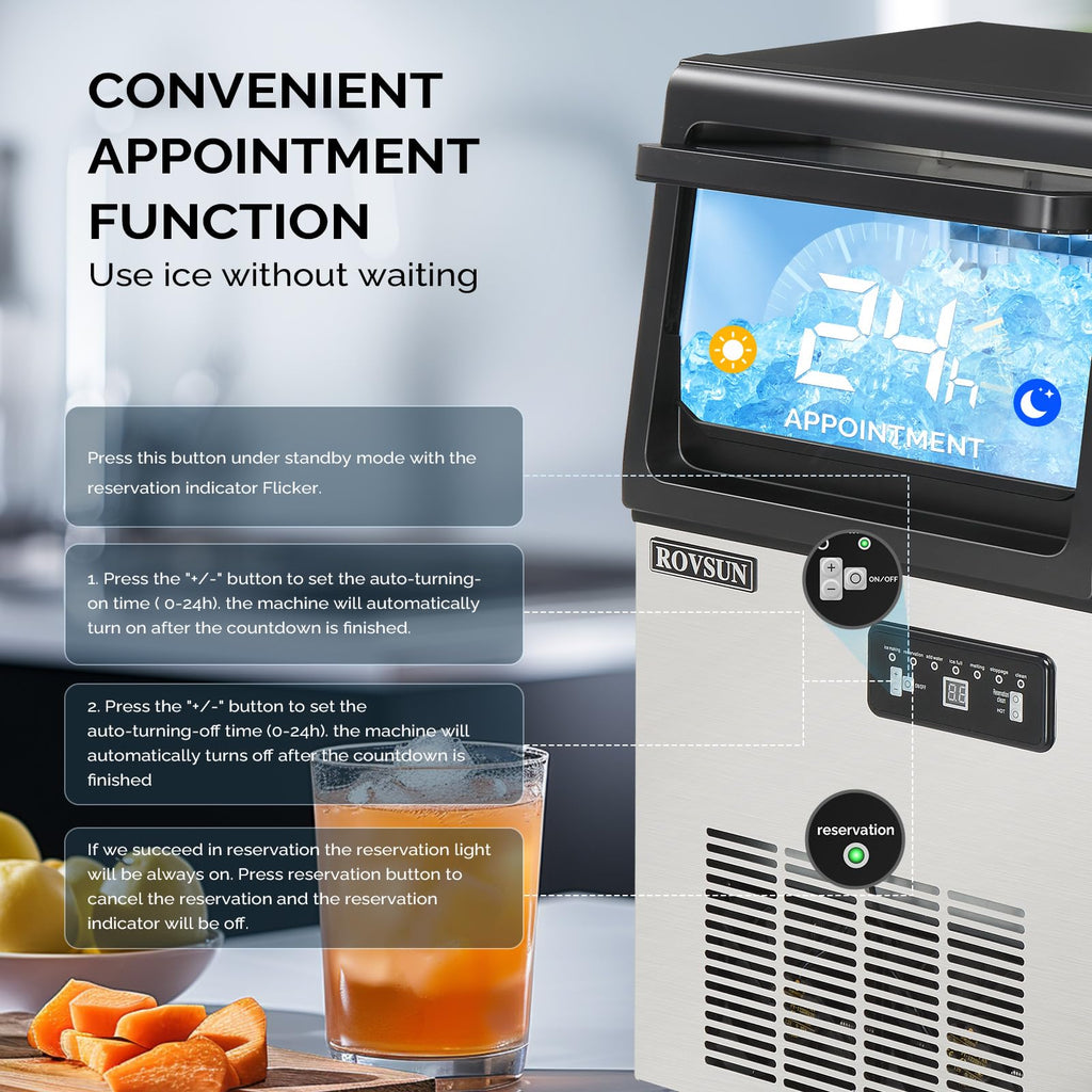 2. Simple Operation: Built with an intuitive and easily use control panel that has an light indicator for displaying water and ice making functions. The ice making time setting and the thickness of ice cubes can be adjusted by pressing the (+) or (-) buttons. Our ice cube-making machine has a 24-hour timer function either, it can realize scheduled shutdown at night and scheduled startup in the morning.