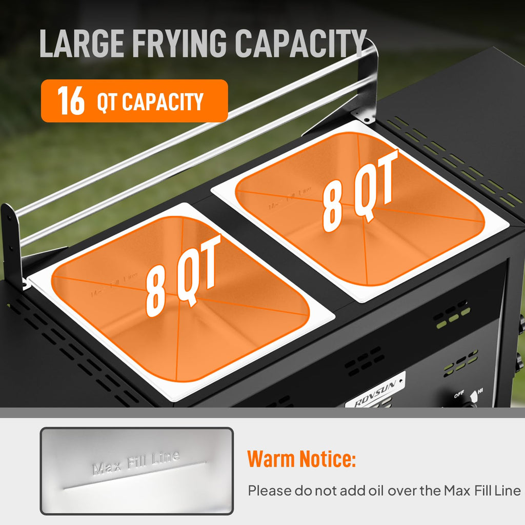 1. Large 4-Gallon Dual Tank Capacity: Features two 8 QT stainless steel fry tanks with a total capacity of 16 QT (4 gallons). Cook large batches of chicken wings, drumsticks, french fries, or whole fish at once—ideal for family feasts and group parties, so everyone enjoys hot, freshly fried food together.