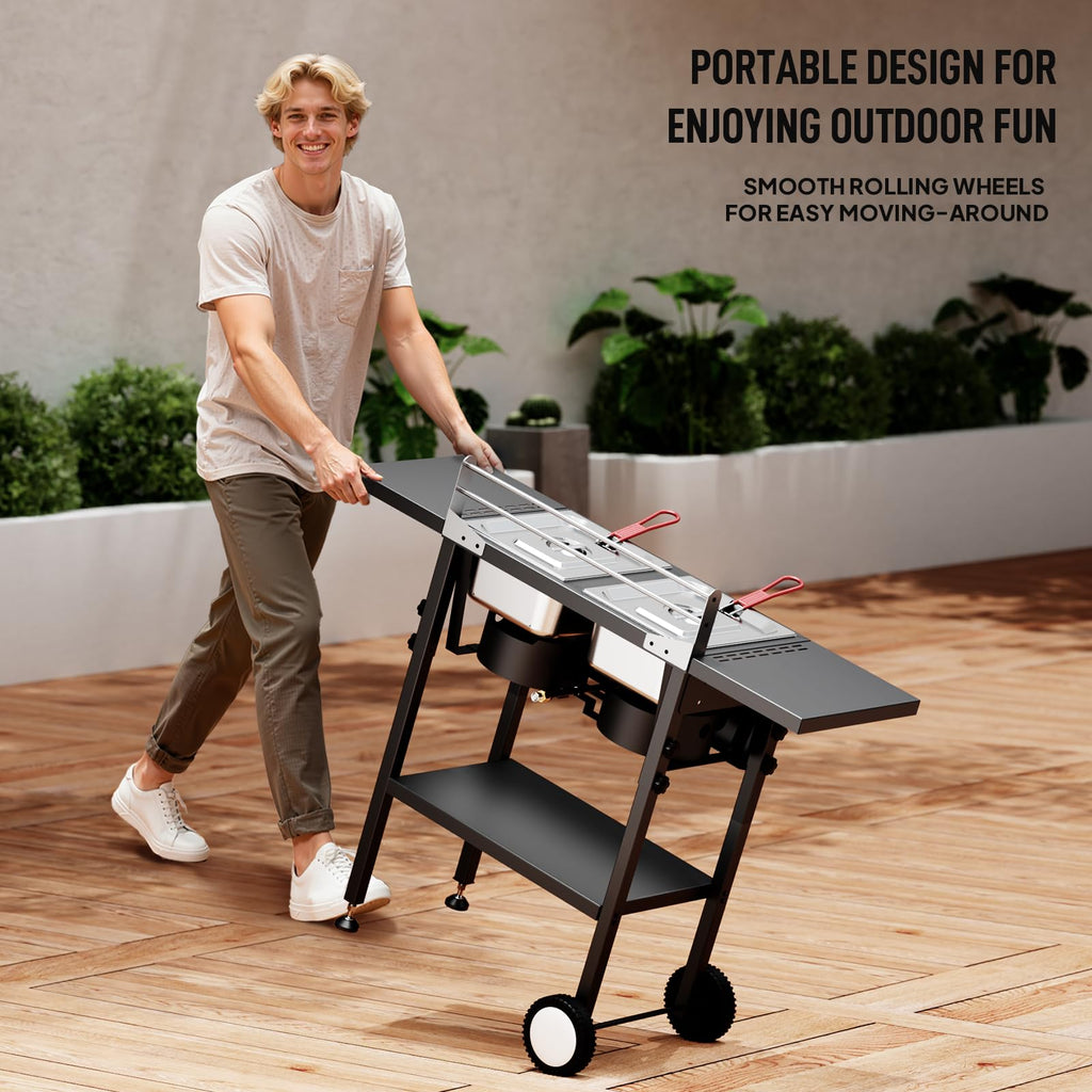 5. Portable with Wheels & Storage Shelf: Take your fryer anywhere with ease! Two sturdy wheels make it simple to move, and the added lower shelf keeps cooking tools organized and within reach. When you’re done, the compact design stores effortlessly.
